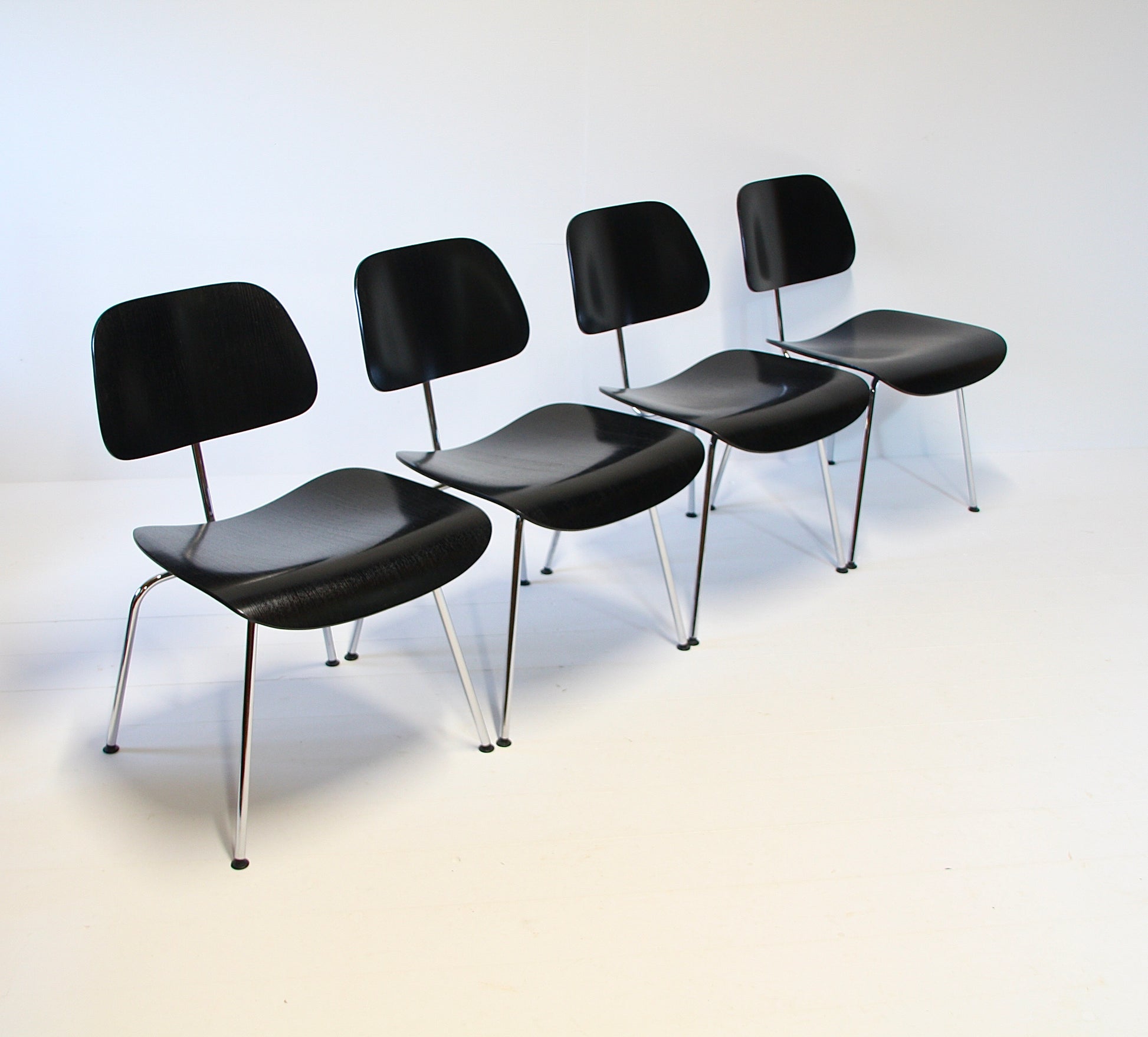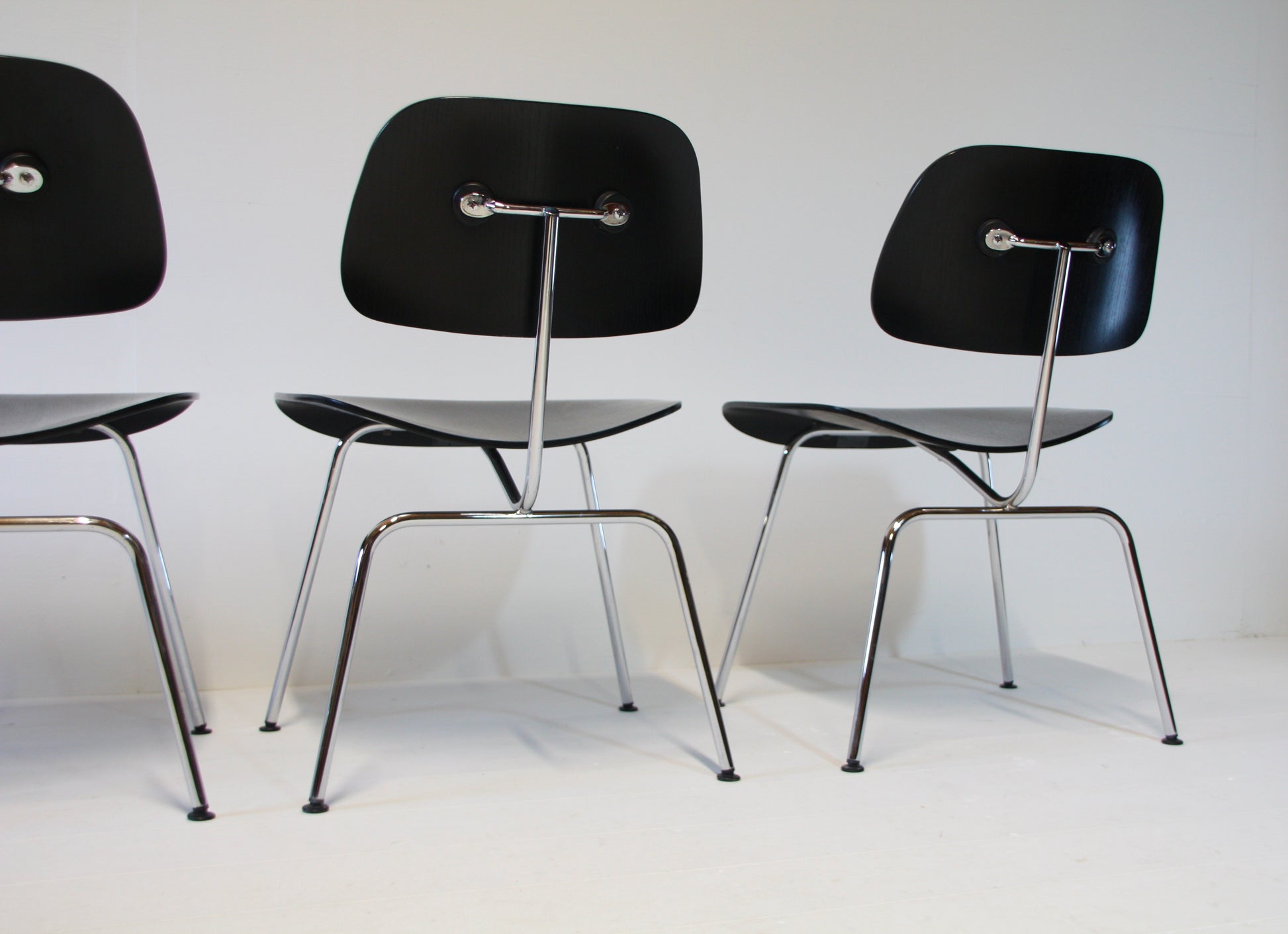 4 mid century modern dining chairs by design duo Charles & Ray Eames, Model DCM (Dining Chair Metal, 1946). Crafted from beautifully formed black ash plywood on a polished chrome frame. Beautiful form with comfortable proportions. A real timeless and iconic design which will complement various interior styles.