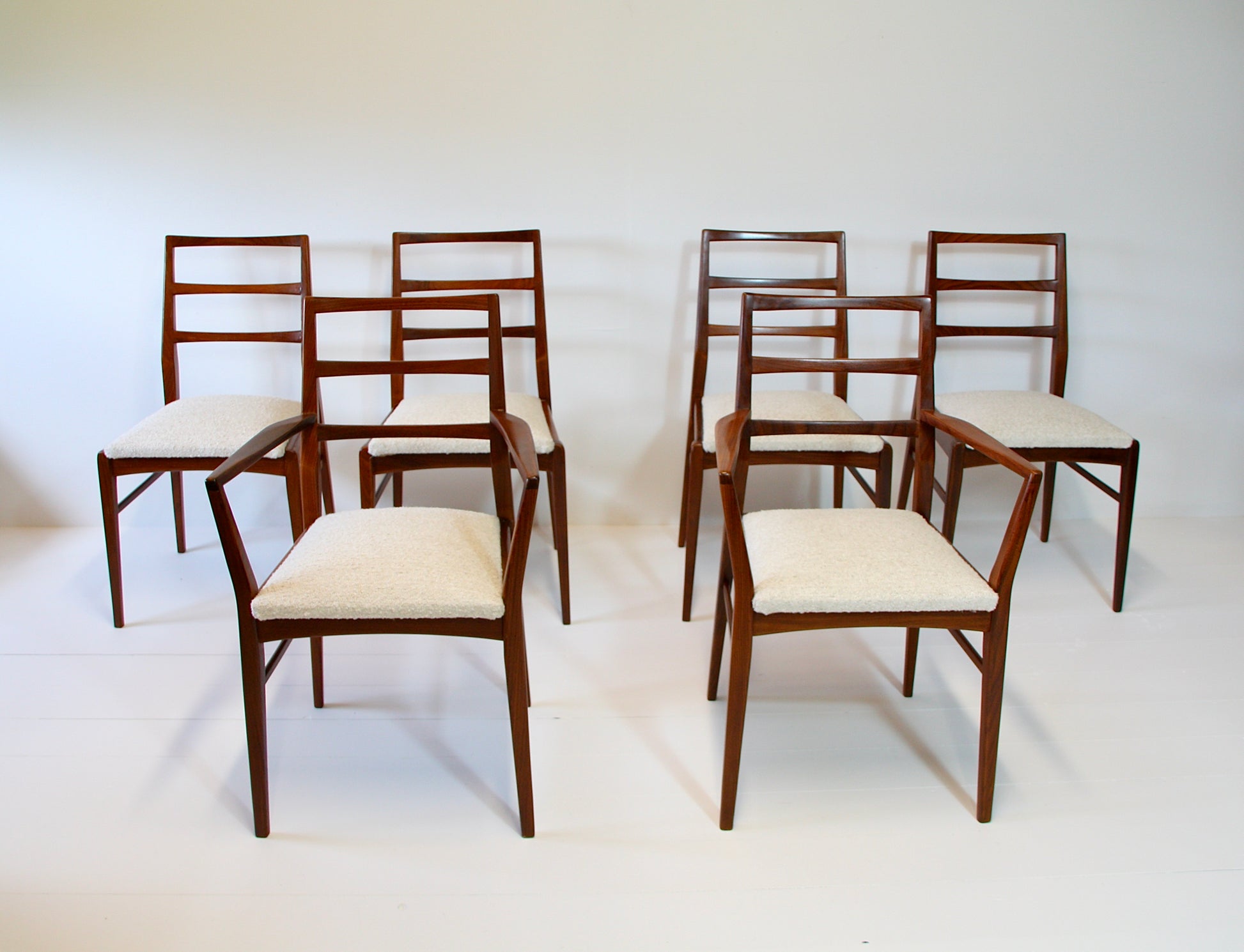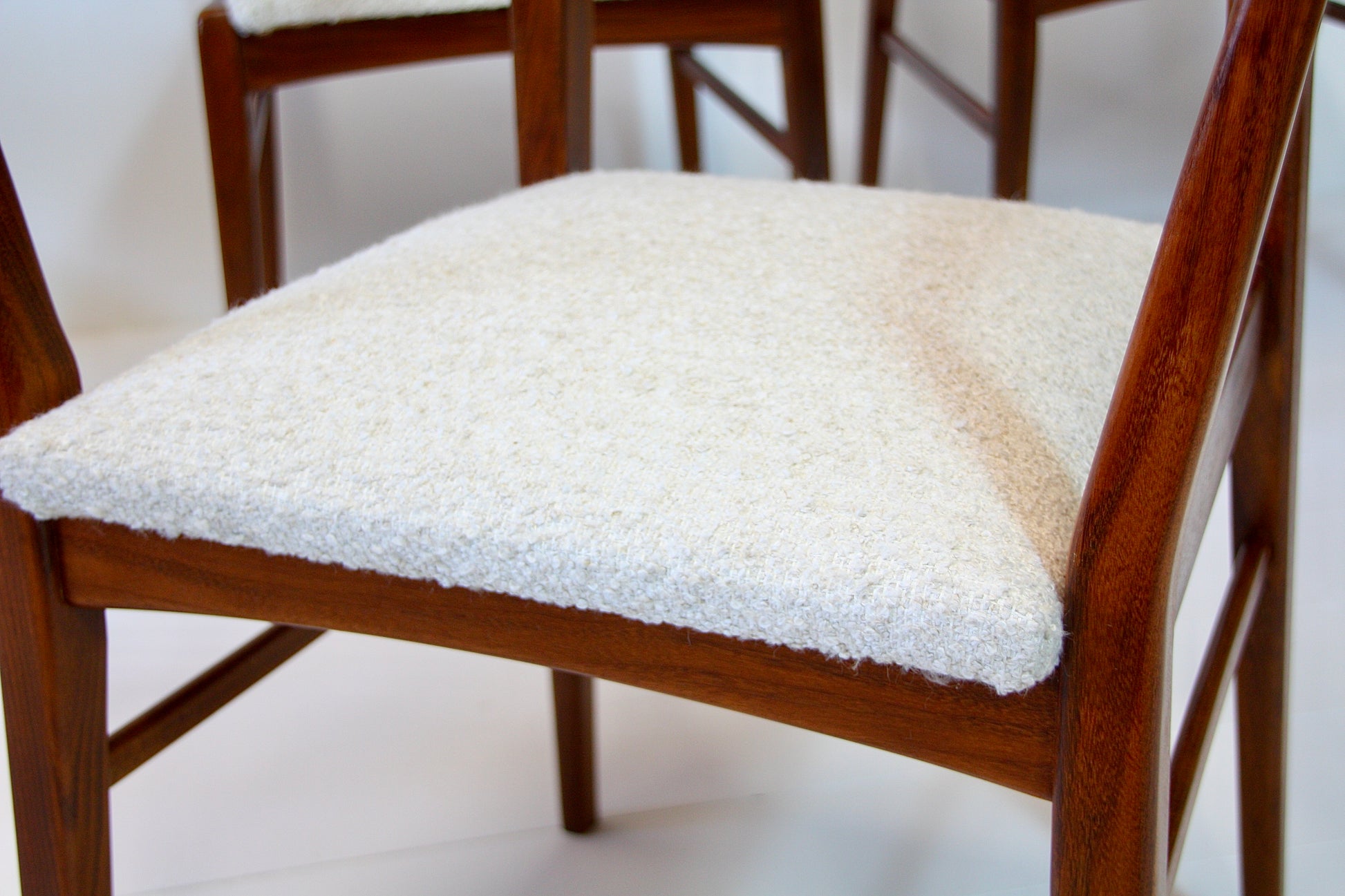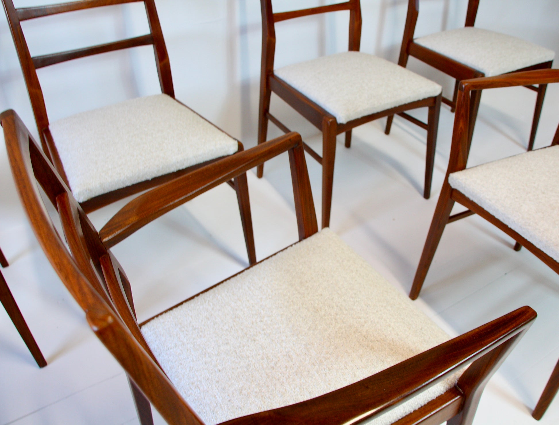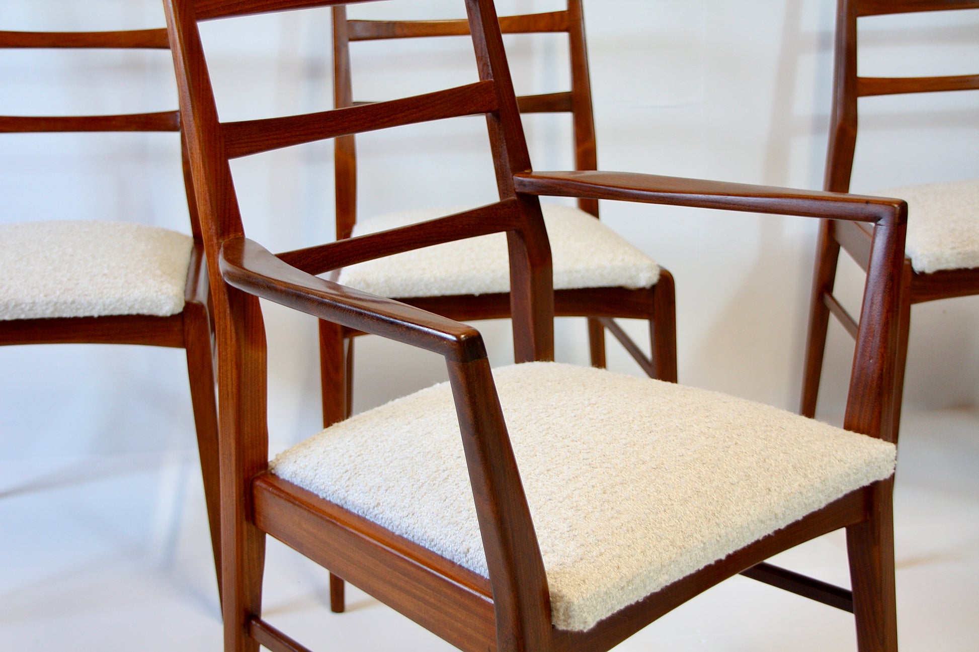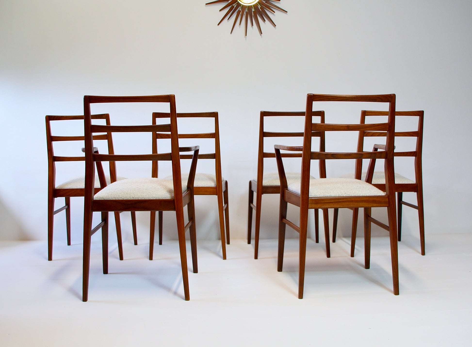 Stunning set of 6 dining chairs designed by Richard Hornby for Fyne ladye and retailed by Heals c.1960. Constructed from beautifully figured solid afromosia (African teak) and upholstered in a premium quality boucle fabric by Andrew Martin. A very elegant design with nice proportions. A great set of British mid century designer chairs.