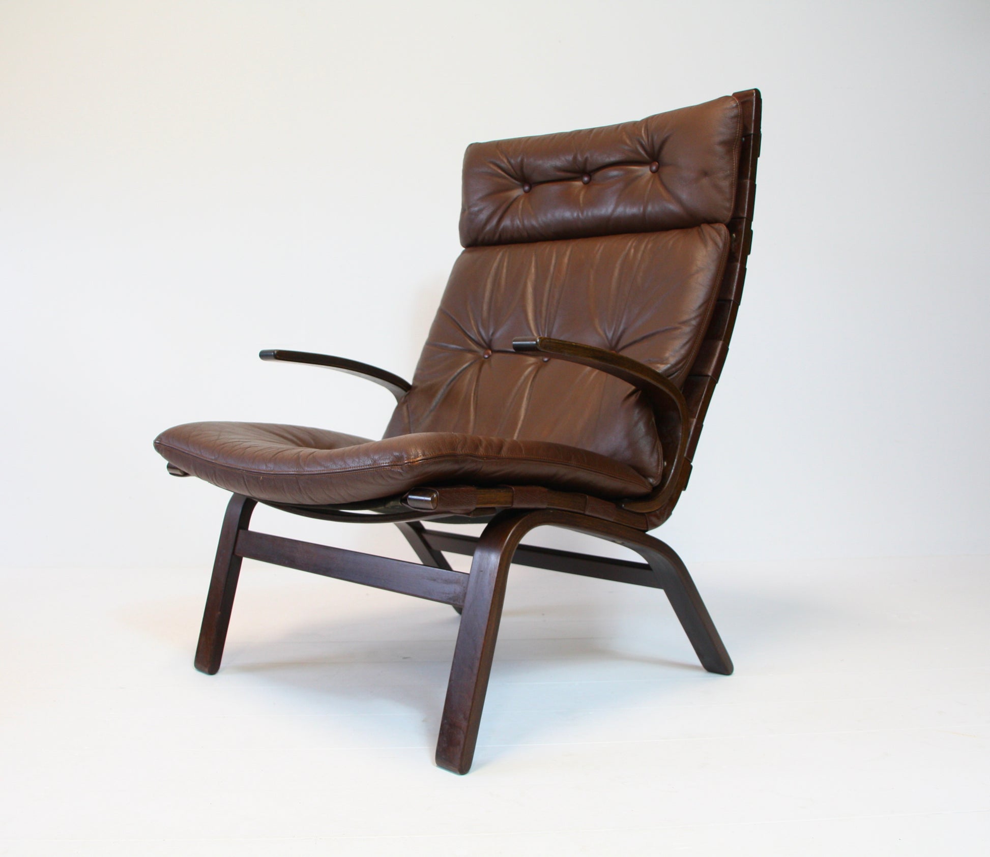 Pair of mid century Danish armchairs by Farstrup (Denmark, c.1970). Constructed from bentwood with nice form and comfortable proportions. High quality leather cushions in dark brown. A very versatile style which will blend well with most interior styles.