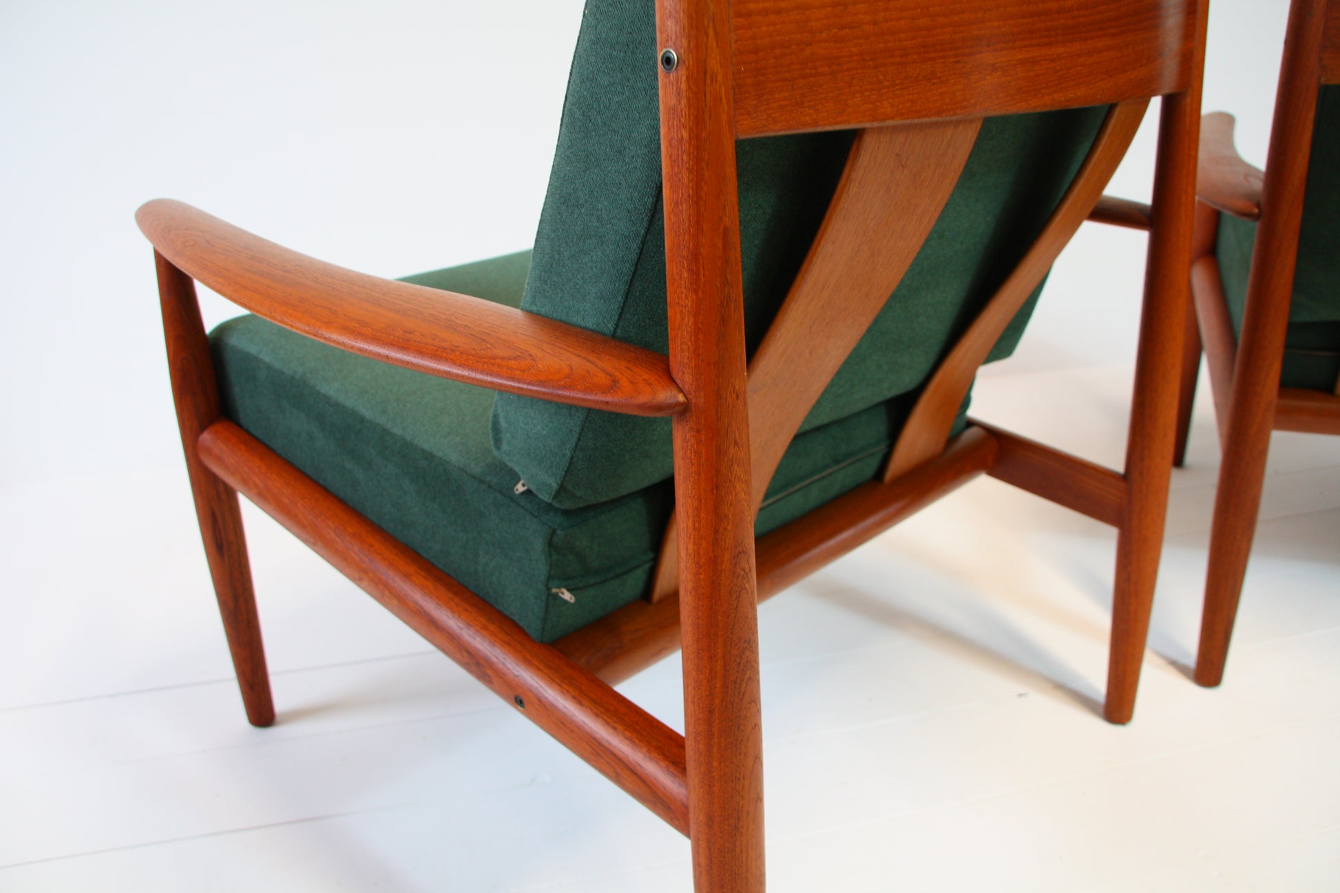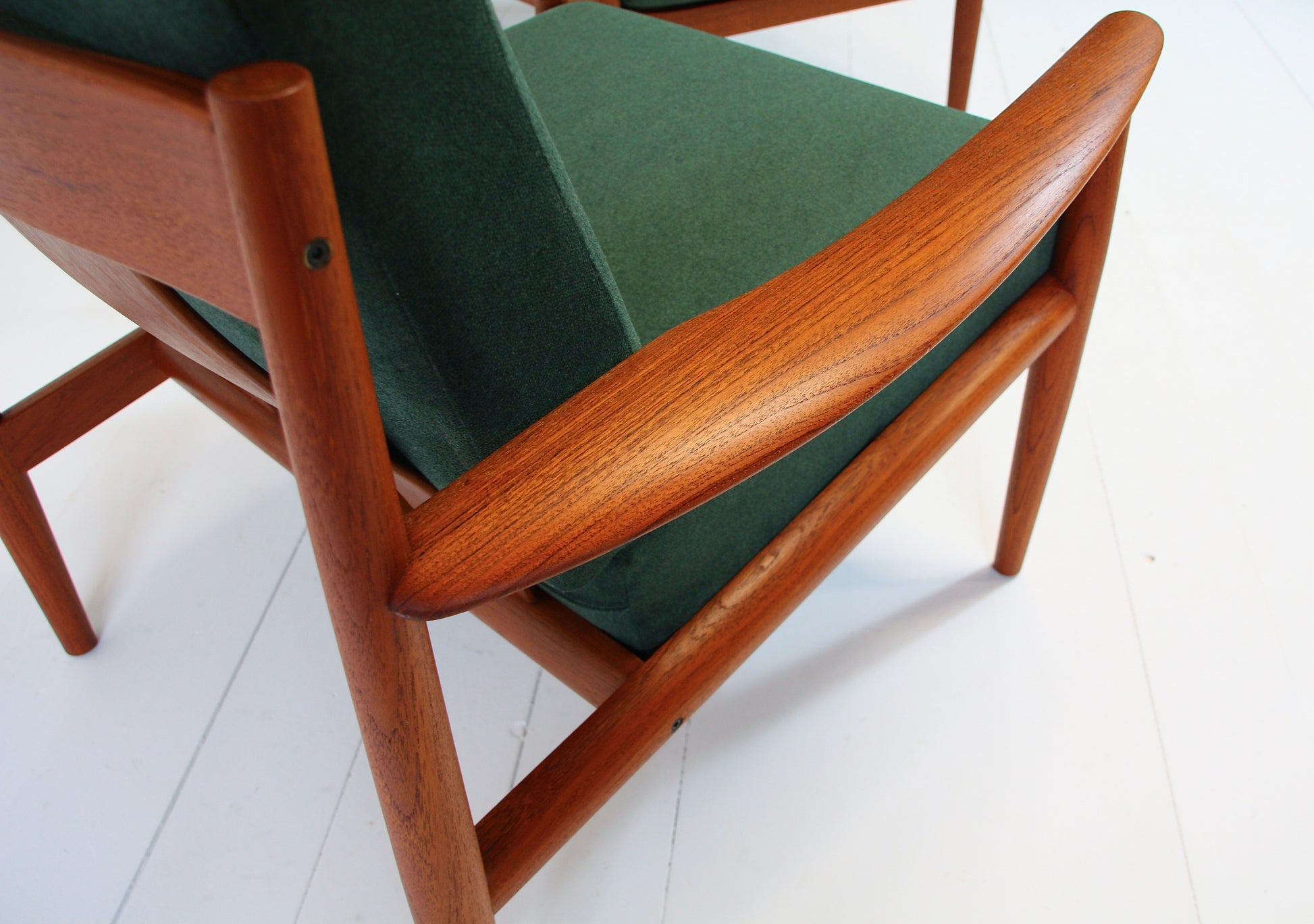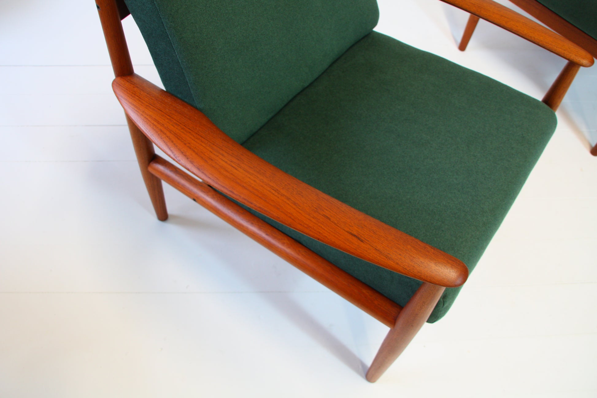 Stunning pair of mid century Danish armchairs designed by Grete Jalk and manufactured by France & Son (Model 128 - 1954). Constructed from premium quality teak and upholstered in a luxury green fabric by Andrew Martin. Beautifully designed chairs with paddle like arms, excellent form and comfortable proportions. Highly collectible armchairs from one of Denmarks finest furniture manufacturers.