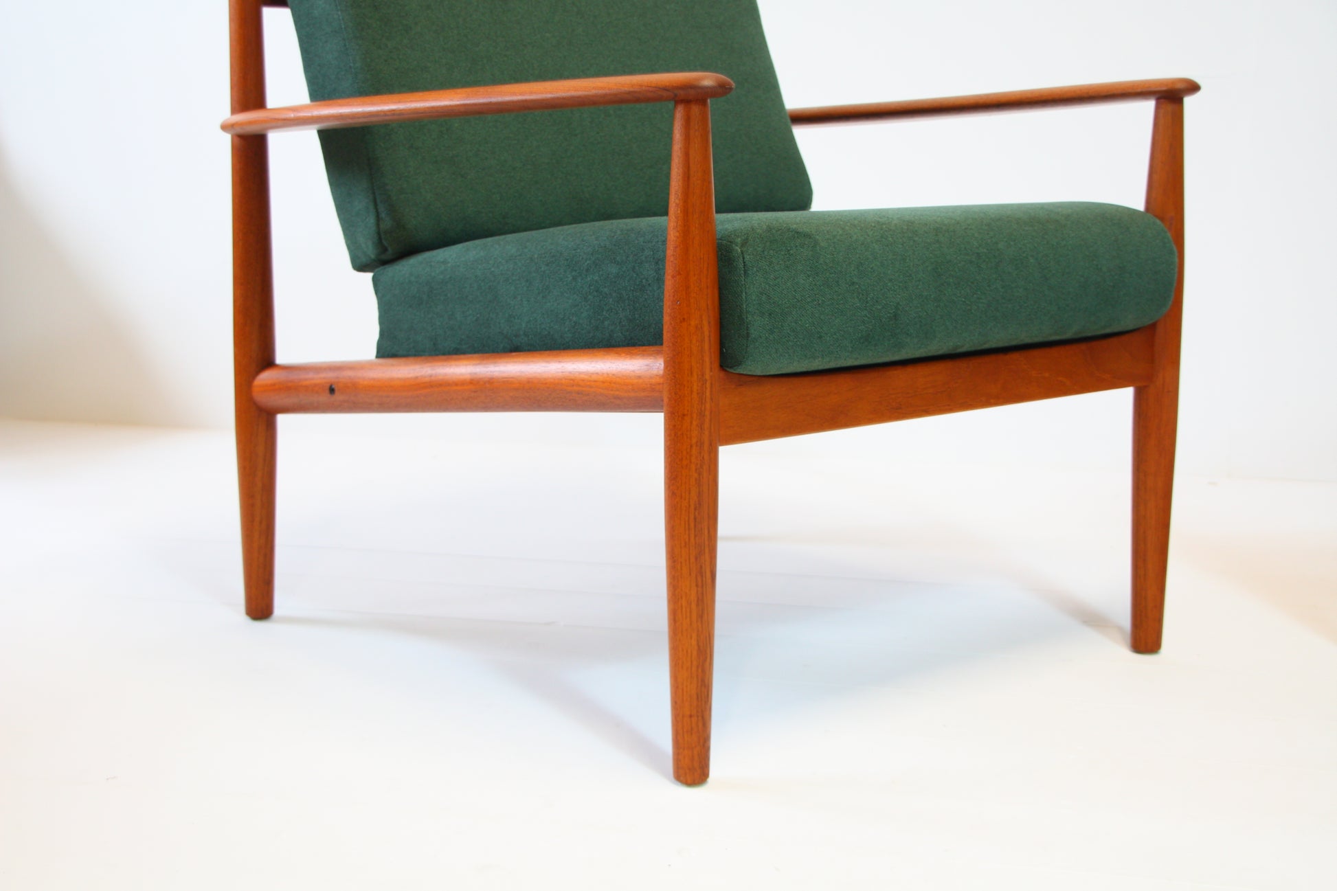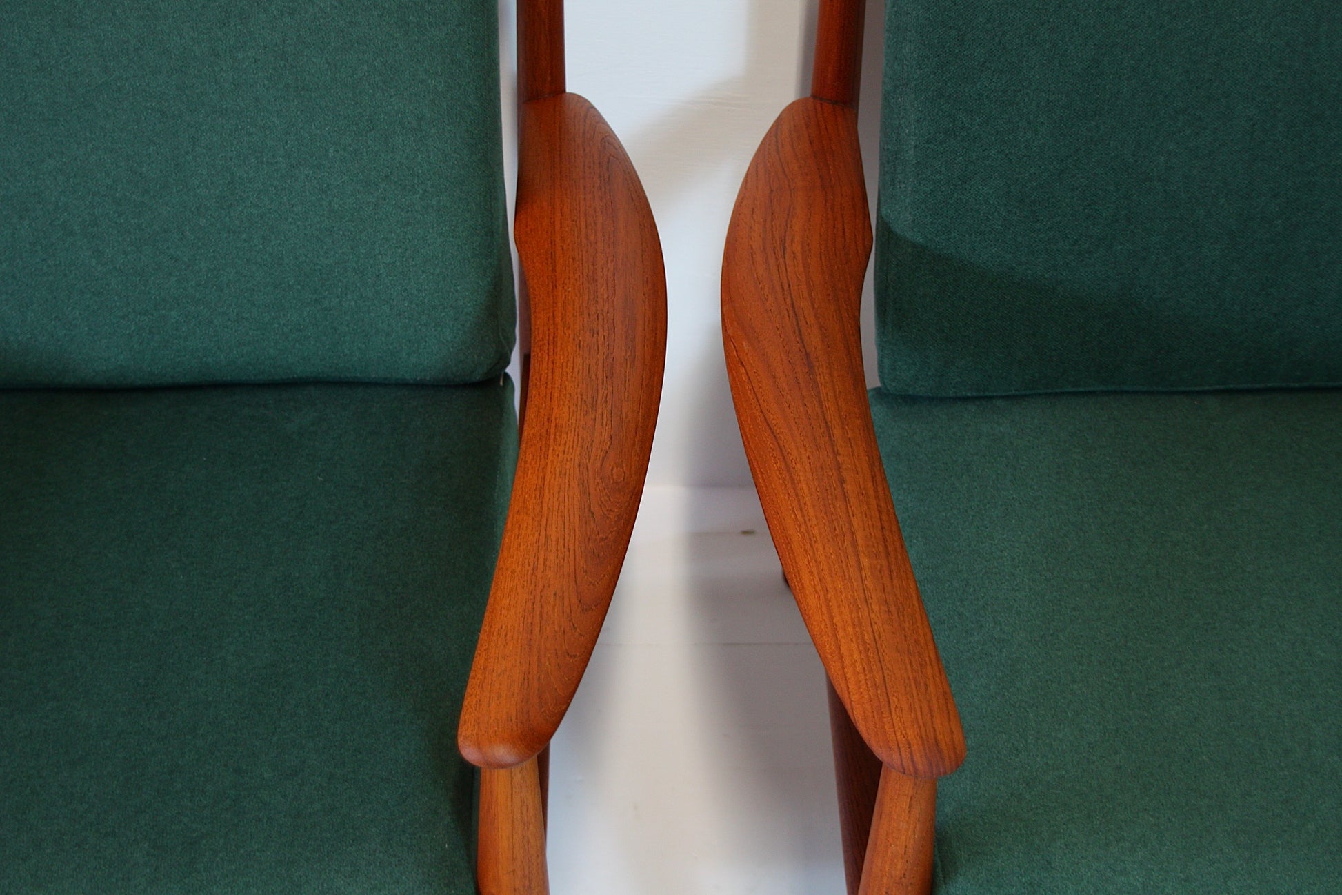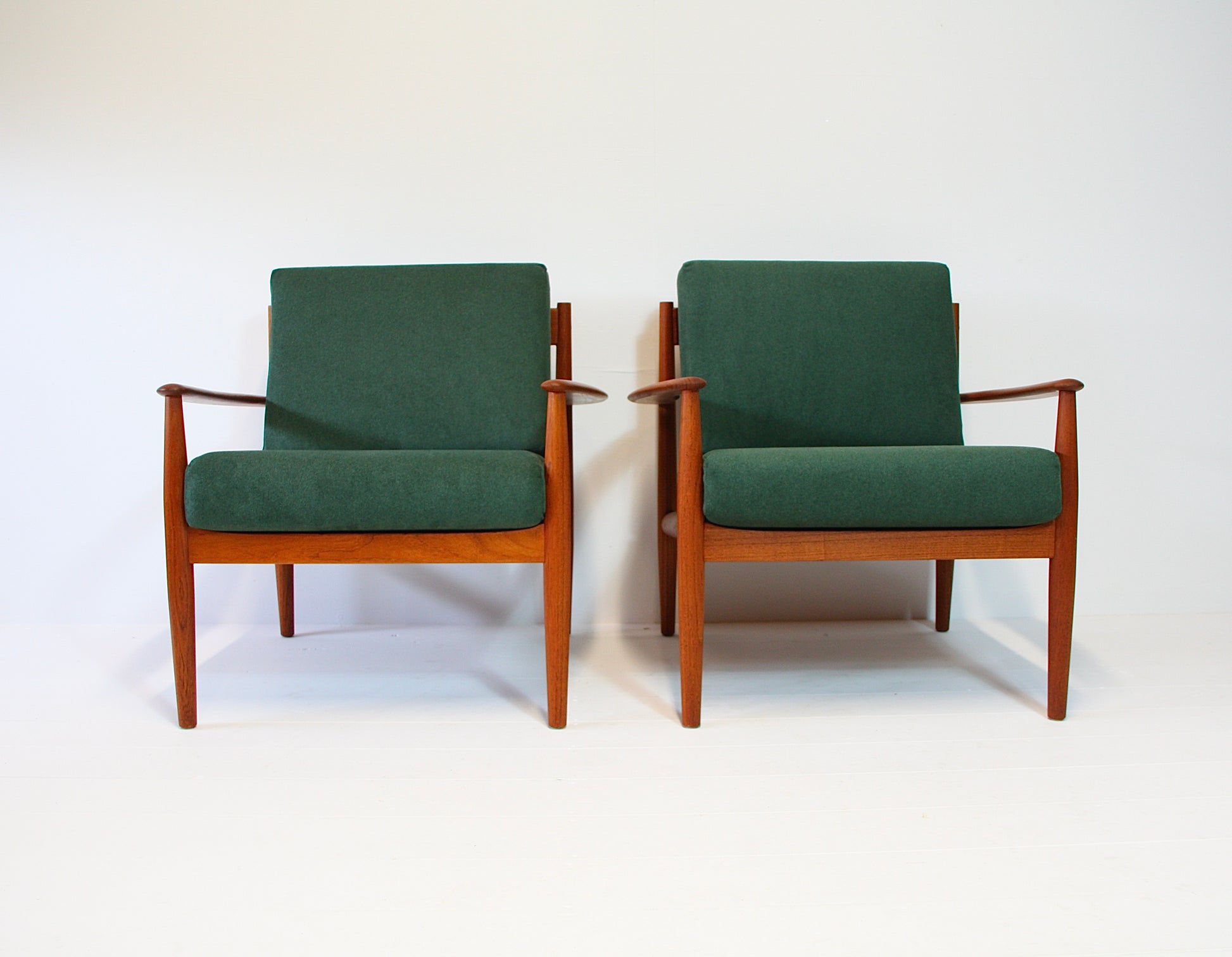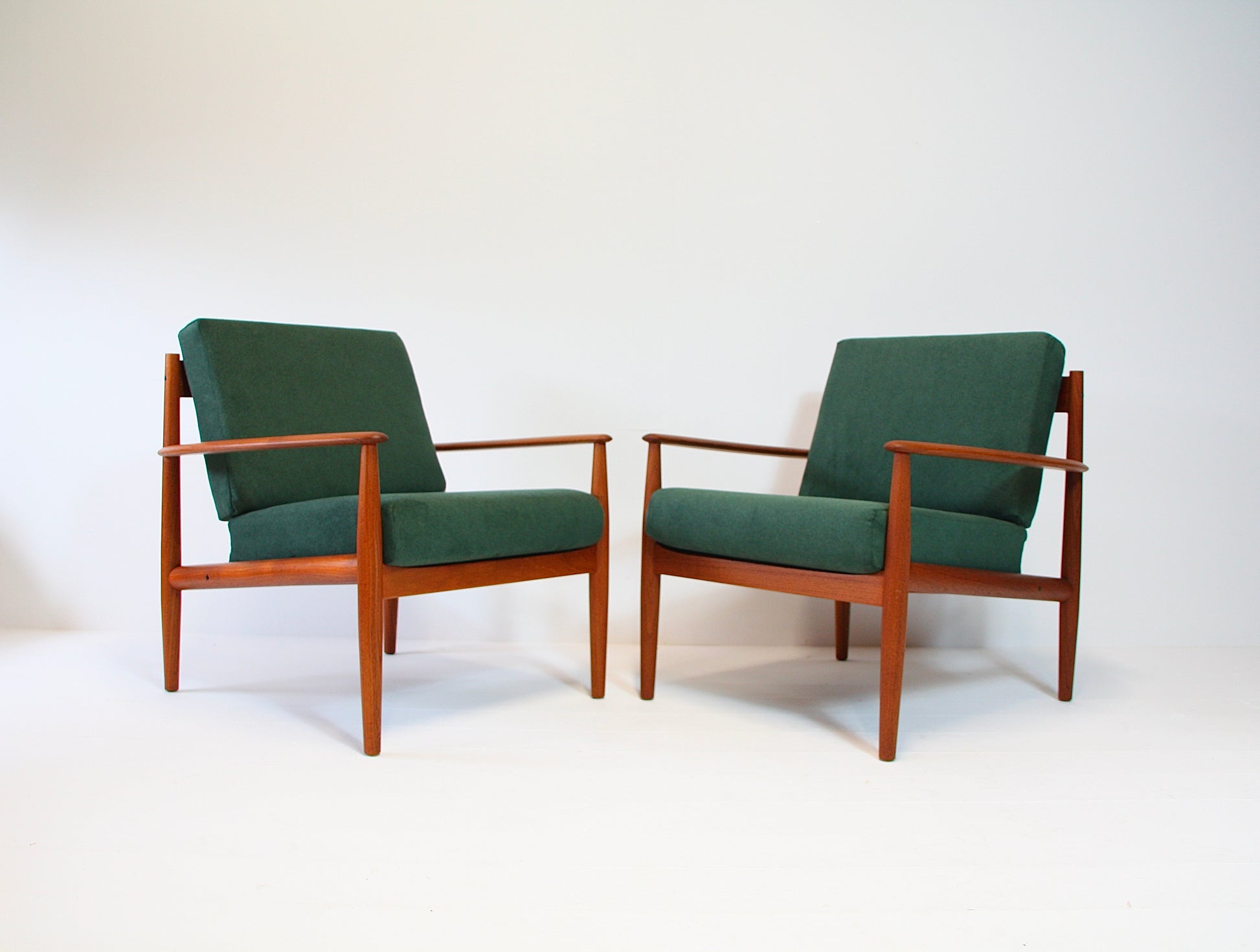 Stunning pair of mid century Danish armchairs designed by Grete Jalk and manufactured by France & Son (Model 128 - 1954). Constructed from premium quality teak and upholstered in a luxury green fabric by Andrew Martin. Beautifully designed chairs with paddle like arms, excellent form and comfortable proportions. Highly collectible armchairs from one of Denmarks finest furniture manufacturers.