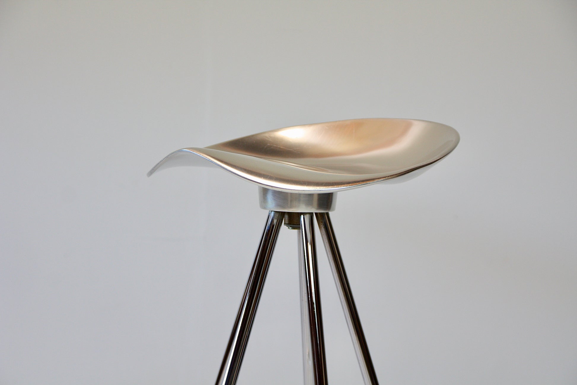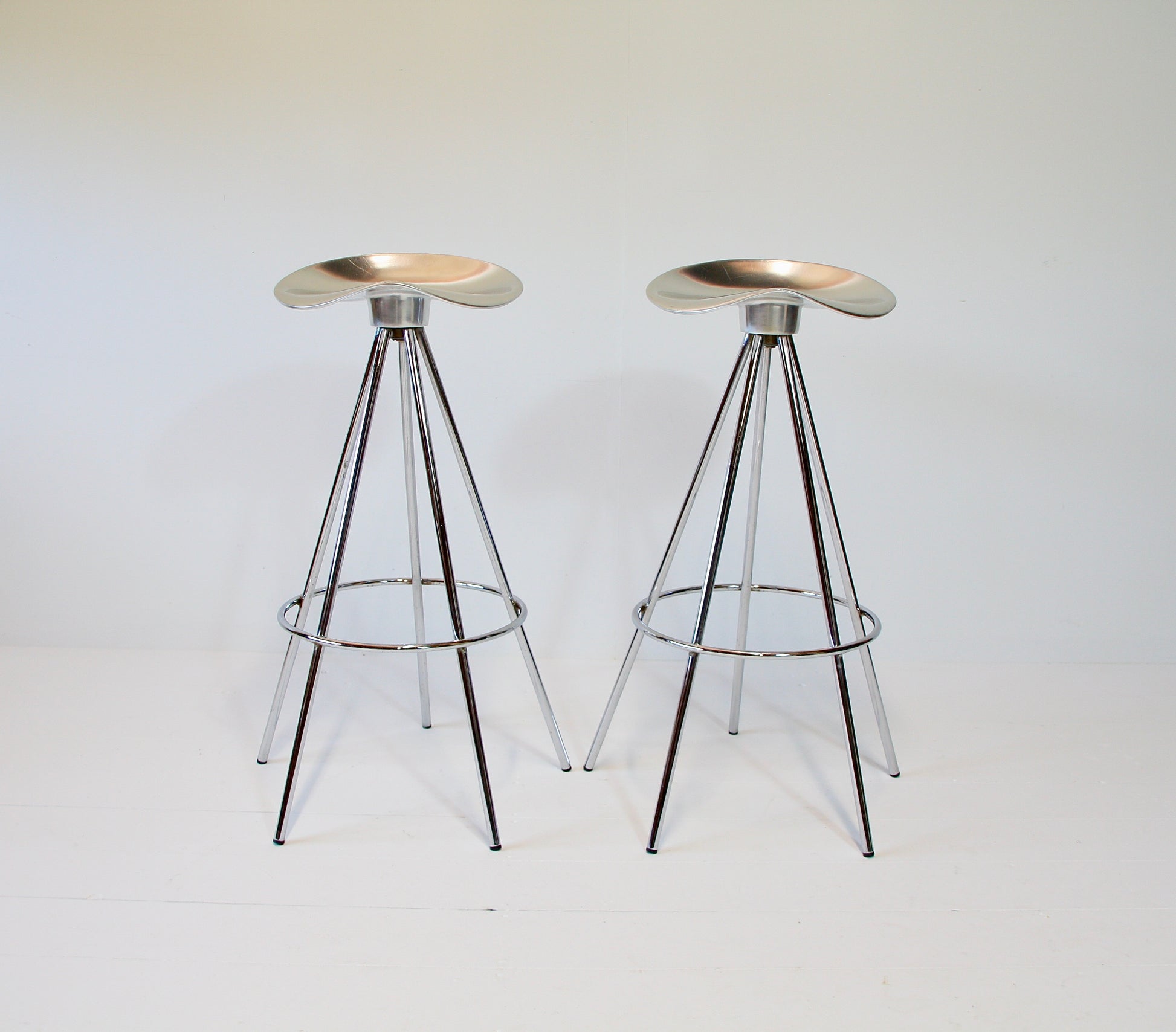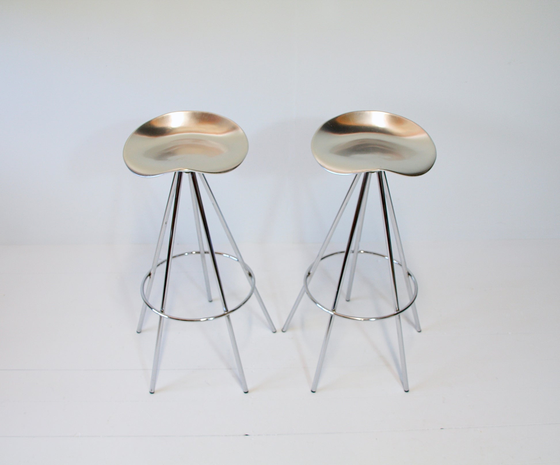 Pair of Jamaica stools designed by Pepe Cortes for Amat, Spain c2000. Polished chrome legs with thick ergonomic aluminium seat tops. A premium quality pair of stools with a good weight and certainly built to last.