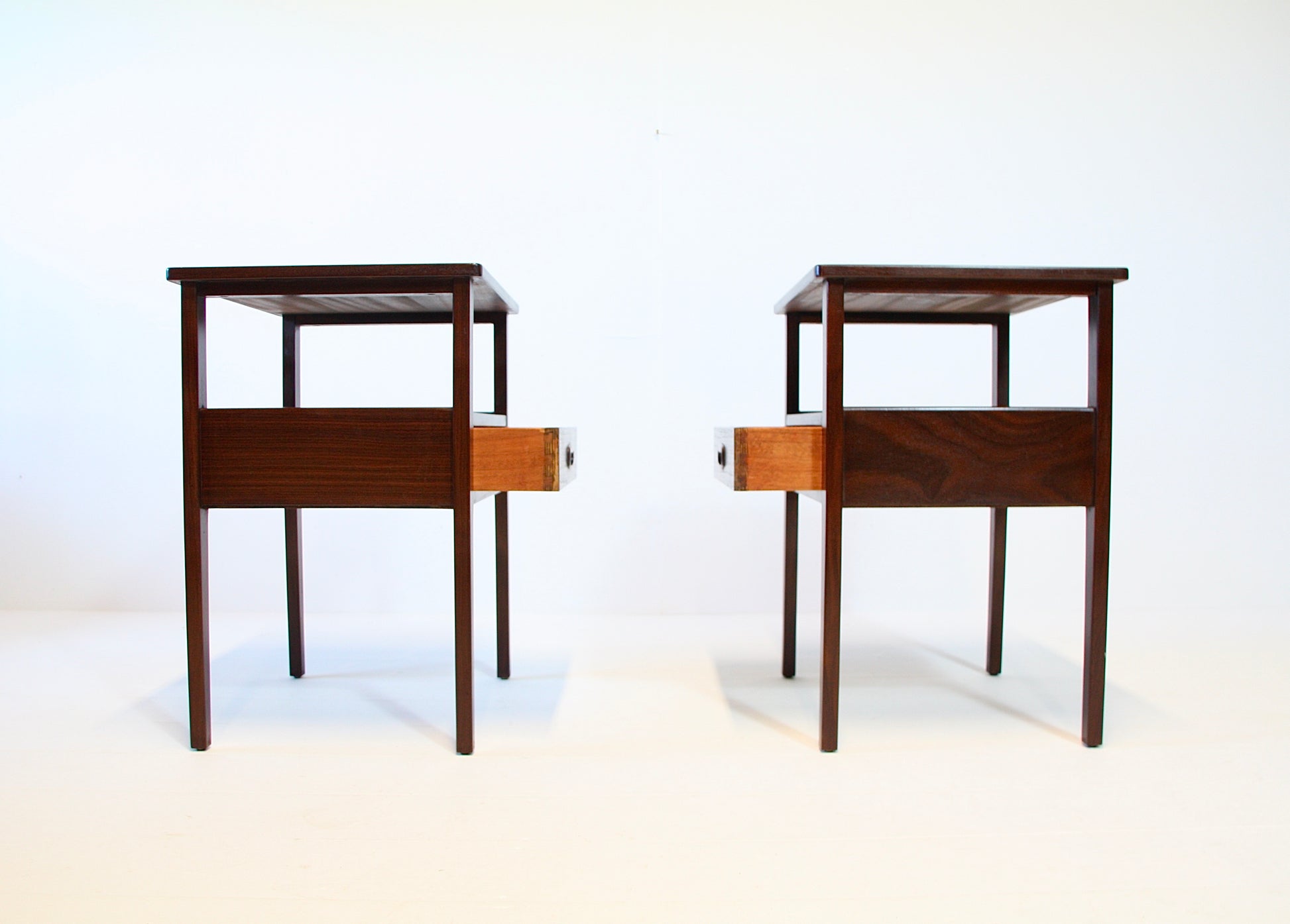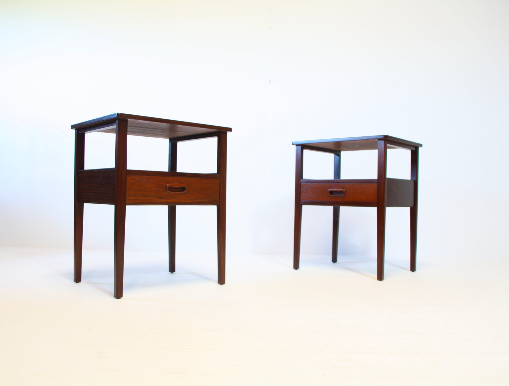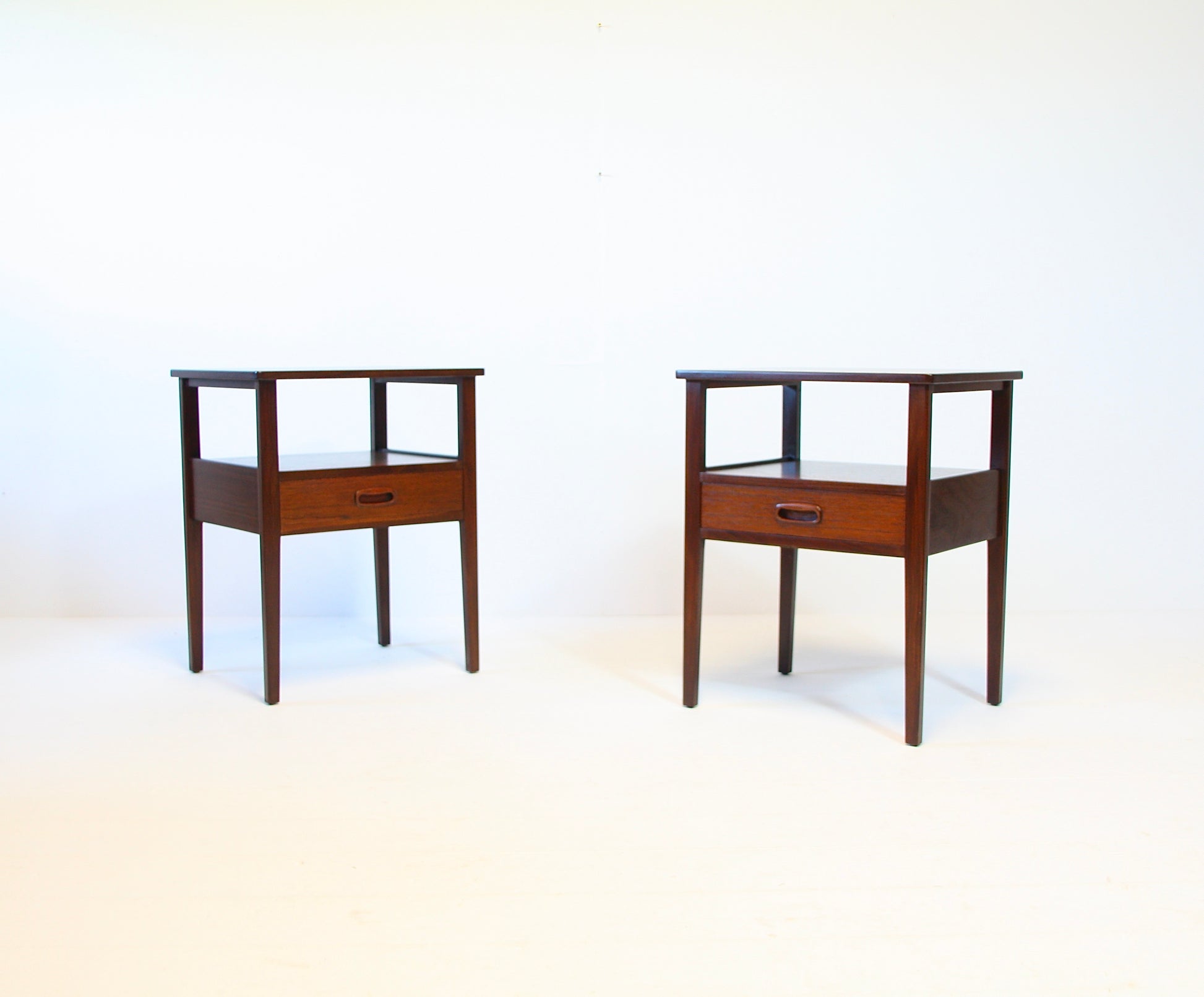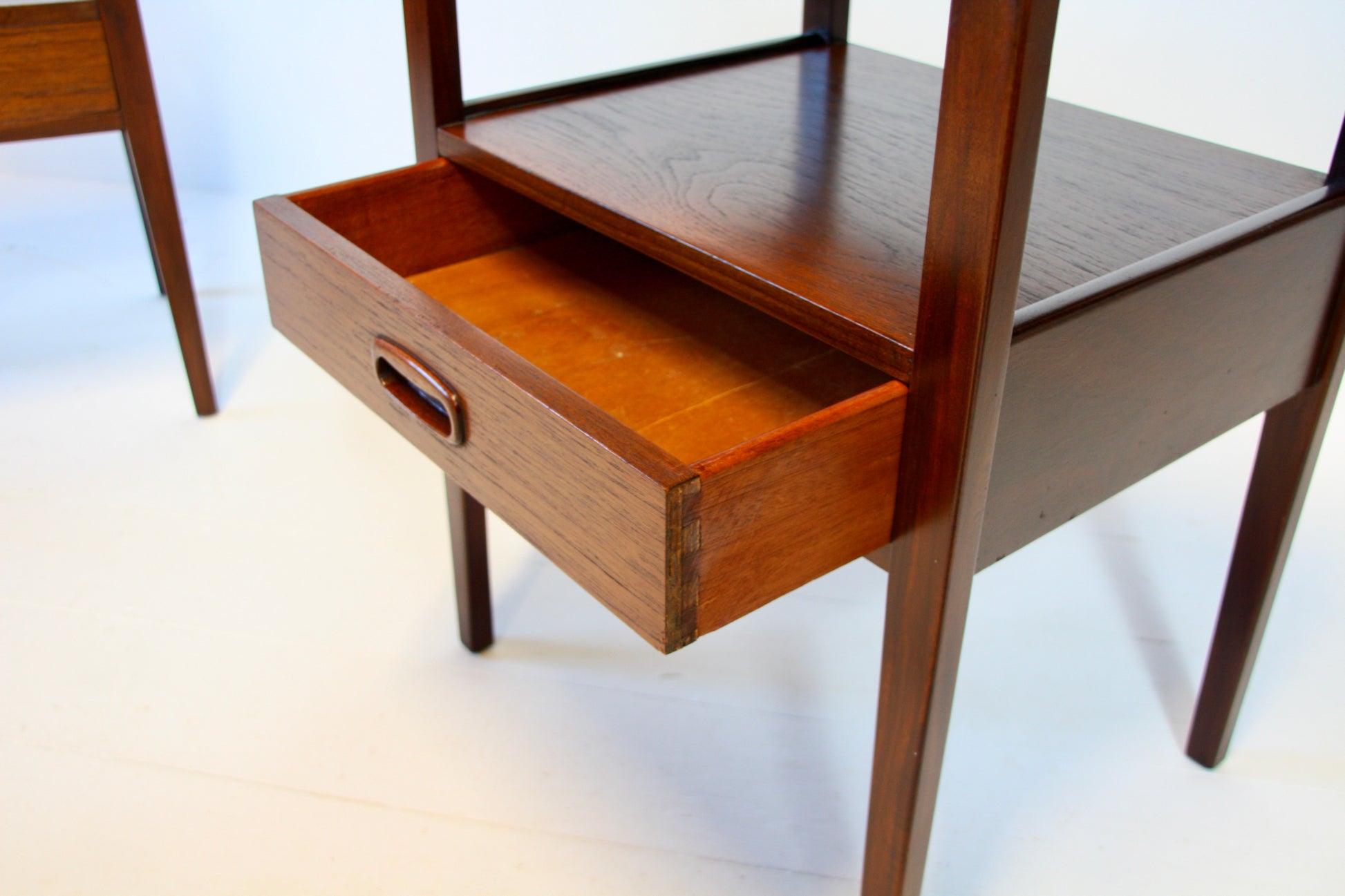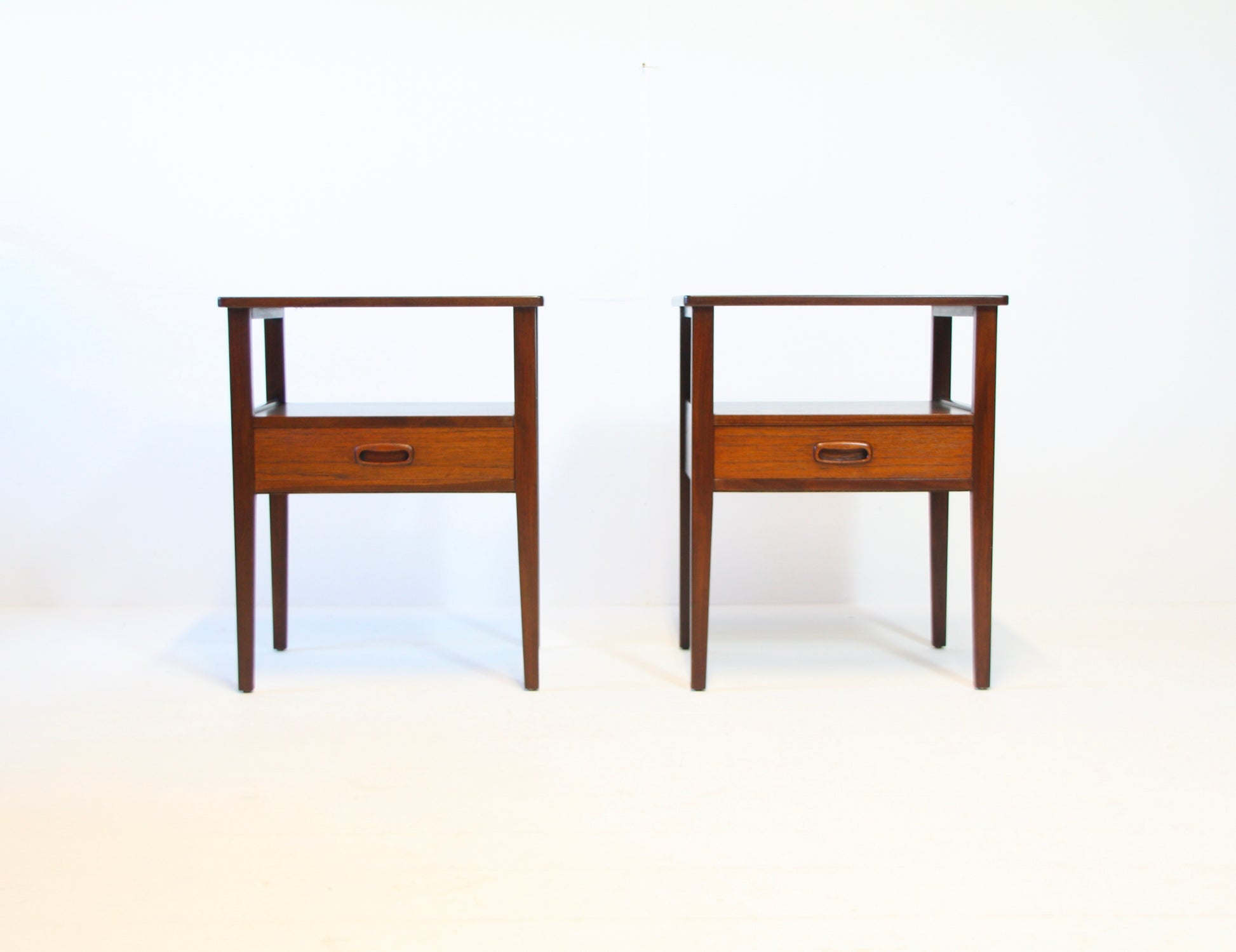 Nice pair of mid century danish nightstands / side tables. Constructed from nice quality teak boasting striking grain detailing and sculpted pulls. A very versatile design to be used in your living room, bedroom or hallway.