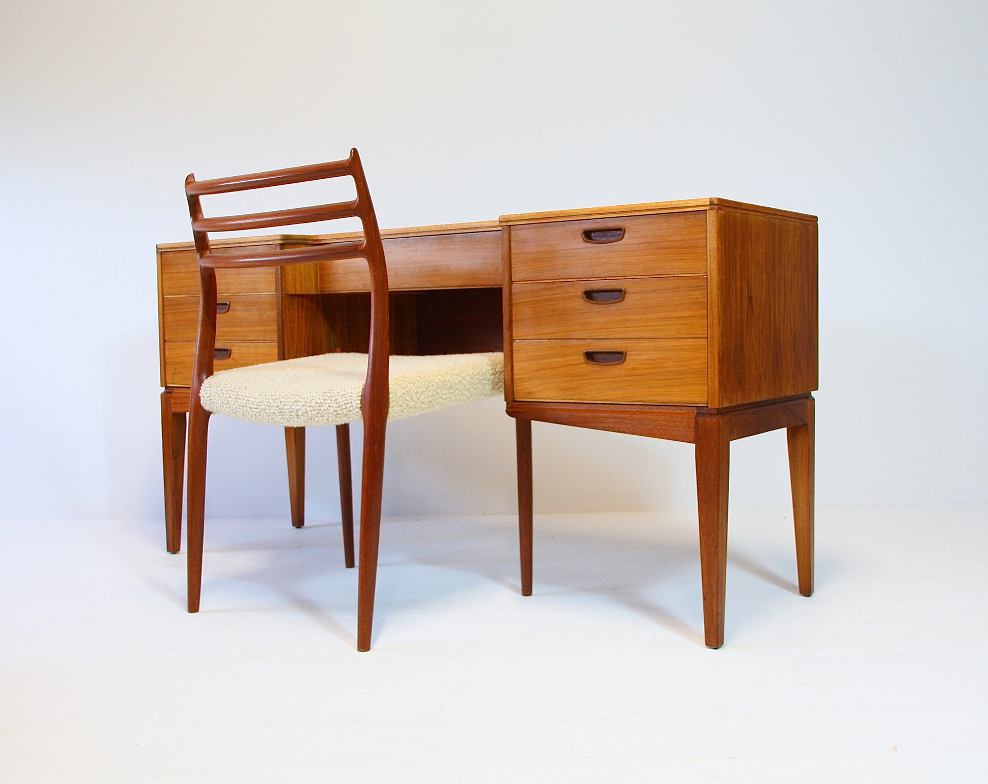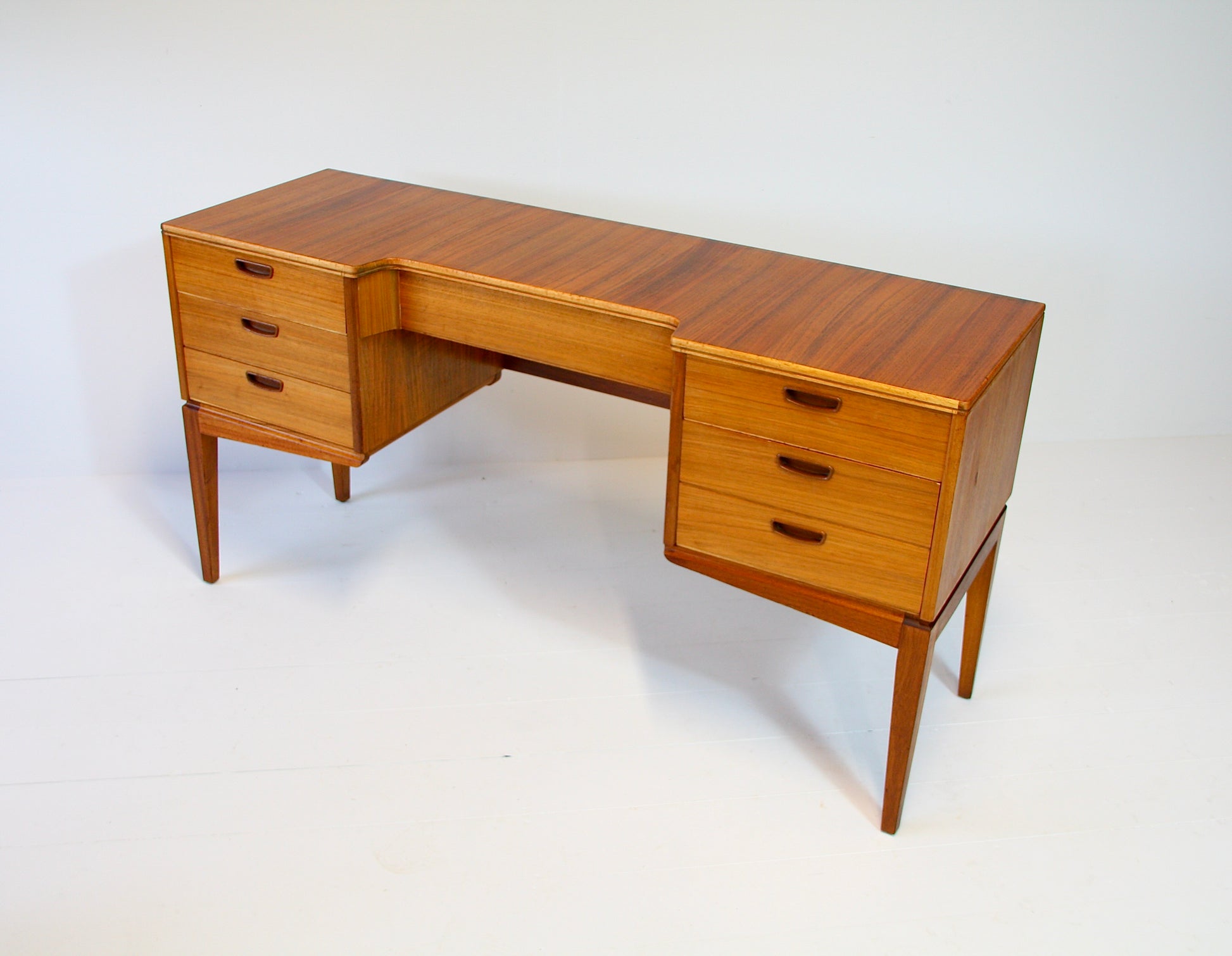 Stunning vintage desk / dresser by Alfred Cox c.1960. Crafted from beautifully figured walnut. An eye catching design clearly heavily influenced by the Scandinavian aesthetic. Featuring a centre felt lined drawer, 2 drawers to the right and 3 to the left. Much smaller than the usual bulky desks on the market making this ideal for someone a little tight on space. A premium quality piece of British mid century design for your home.
