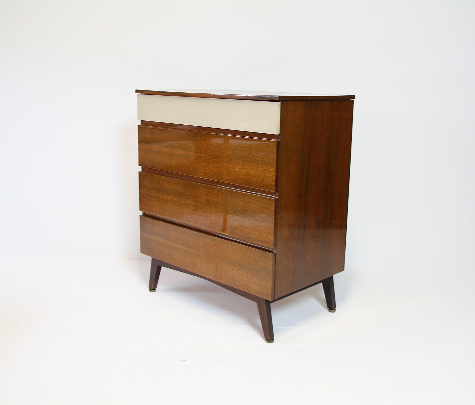 Nice vintage chest of drawers by Meredew c.1960. A unique high gloss finish featuring 3 drawers in walnut and one white. Ideal for your living room, bedroom or hallway.
