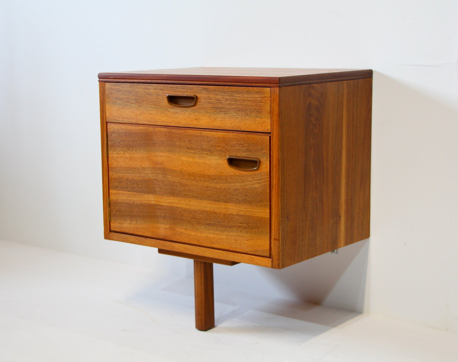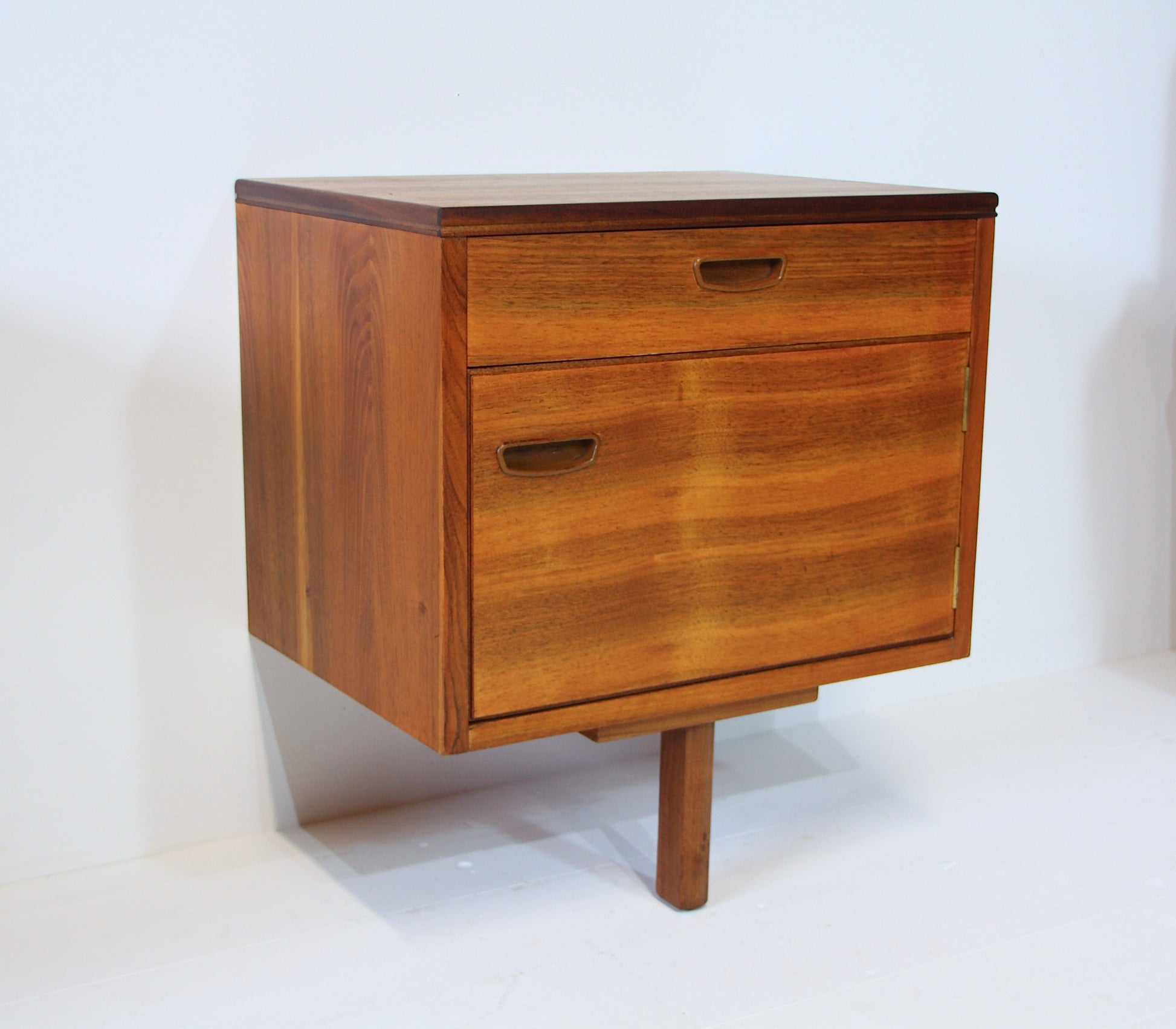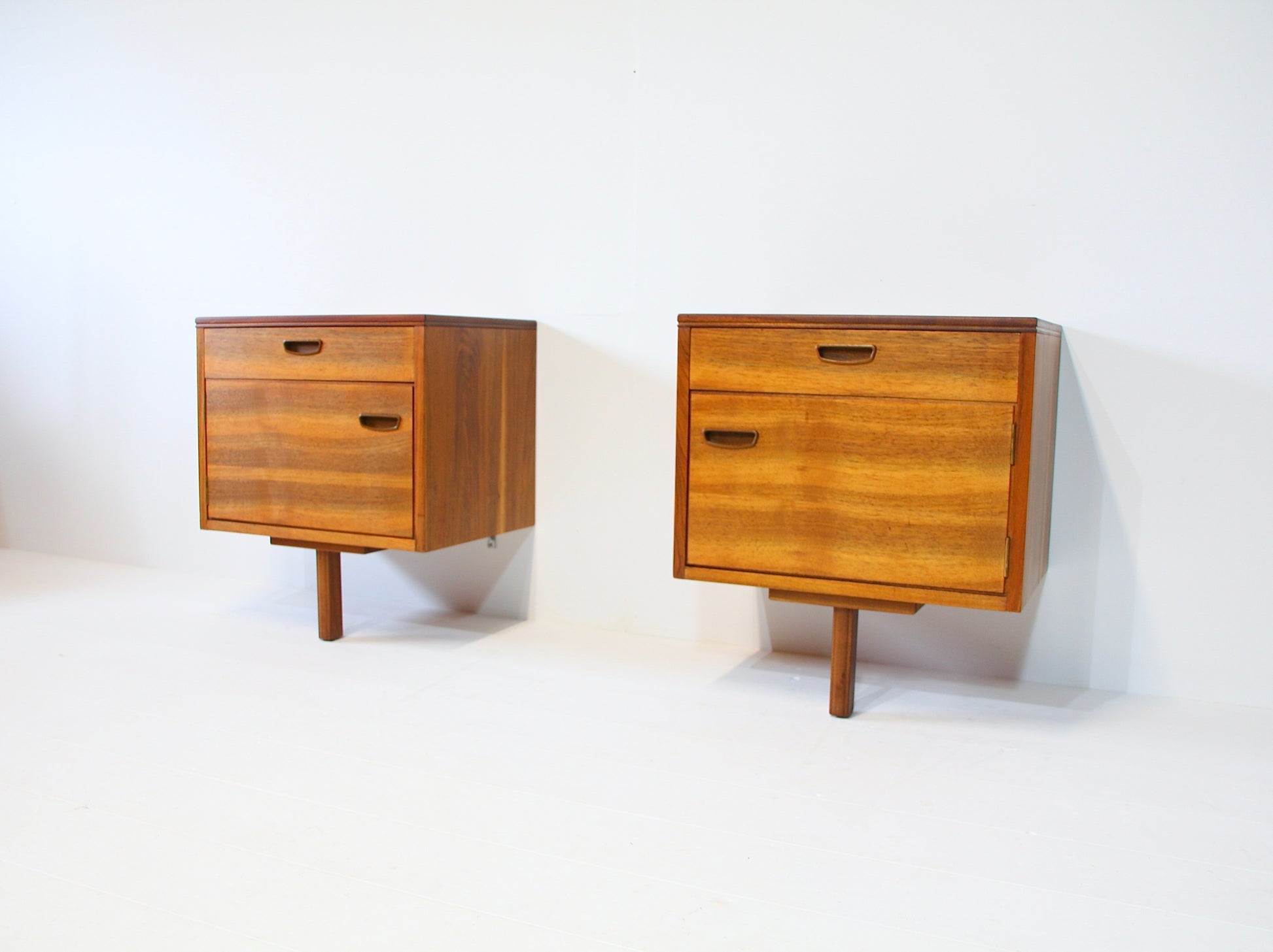 Vintage mid 20th century bedside tables designed by Alfred Cox c.1960. Made from beautifully figured walnut with nice dovetail joinery to the drawers. A super stylish design heavily influenced by Scandinavian modern. Brackets to the rear which enable you to fix them to the wall. A nice addition to your bedroom.